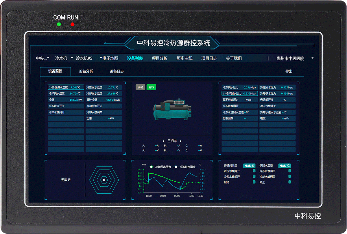 中科易控冷热源智能群控系统是一套集系统集成、控制优化、远程预警、高效节能、无人值守等多功能于一体。系统涵盖中央空调前端智控系统控制优化和末端智控系统控制优化两大部分。系统通过模型辨识、多变量控制、实时优化、设备建模、工艺仿真等技术,实现暖通智控系统的控制优化,最终降低系统人工依赖,提高运行稳定性,延长设备使用寿命,实现节能降耗等综合效益。
