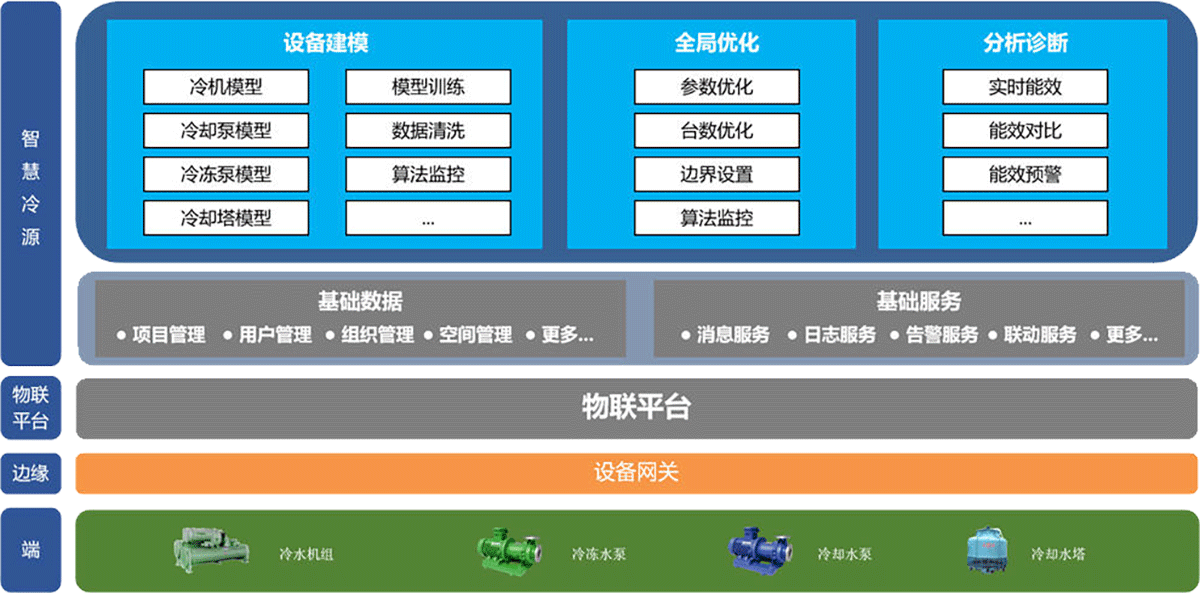系统架构 通过大数据、人工智能和机器学习等技术,按照系统“按需供冷,全局寻优”的原则,对中央空调冷热源系统进行AI全局优化控制,实现冷热源系统高效运行。