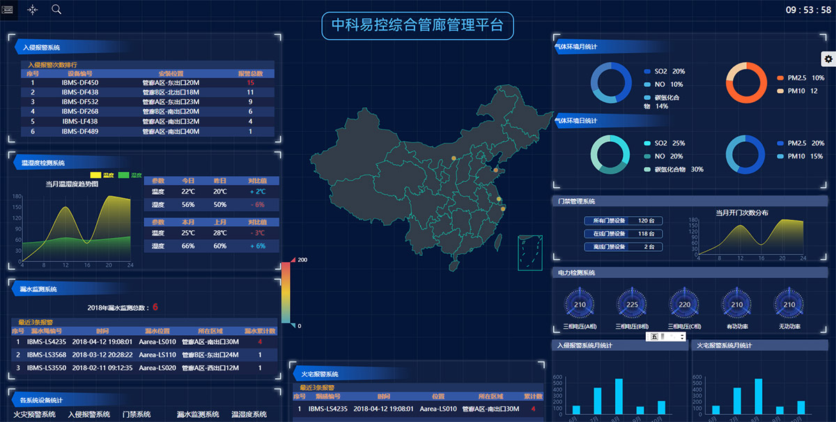 中科易控综合管廊管理系统采用云计算、物联网、大数据、GIS、BIM等高新技术,系统集环境设备监控、安防监控系统、通信系统、消防监控系统、巡检管理、设备管理、人员管控、出入廊管理系统为一体,实现对管廊/隧道全方位、全时段的有效管理, 保障管廊安全、高效、规范运行。